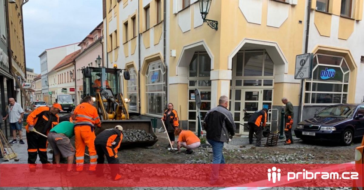 Pracovníci technických služeb nyní odstraňují následky přívalových dešťů, které přišly s nočními bouřemi. V ulicích Pražská a Zahradnická byly odplaveny dlažební kostky.