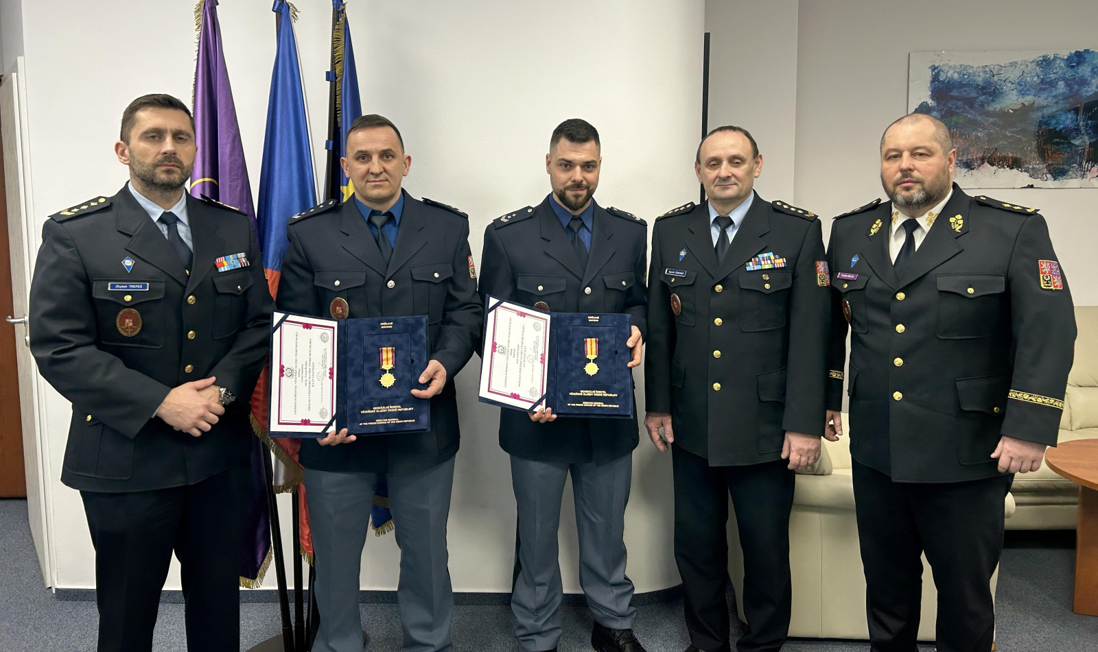 Dva příslušníci z Věznice Příbram převzali z rukou generálního ředitele genmjr. Tomáše Hůlky medaili Za statečnost za mimořádně pohotové a profesionální jednání při vážné dopravní nehodě.