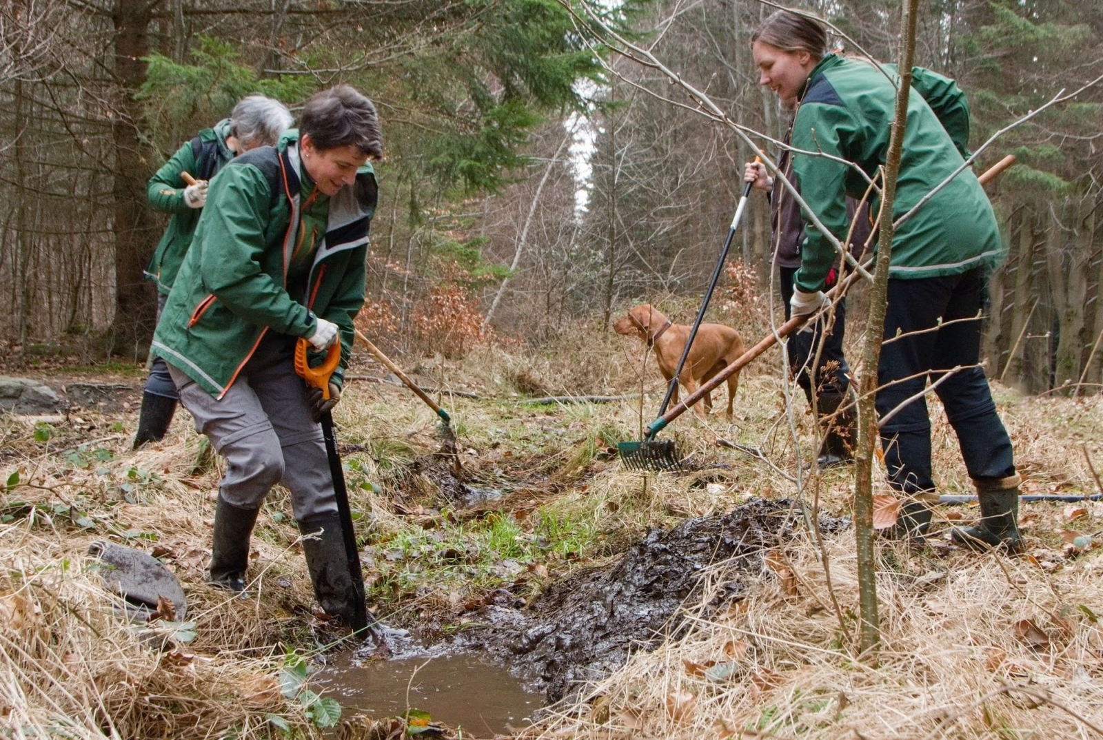 Zaměstnanci Správy CHKO Brdy spolu ze zoologem okresního muzea Davidem Fišerem prožili první jarní den prací v terénu. Vzali si s sebou rýče, hrábě a vyrazili obnovit tůňky v lesním prameništi a na přilehlé strouze, kde se vyvíjejí larvy mloků skvrnitých.