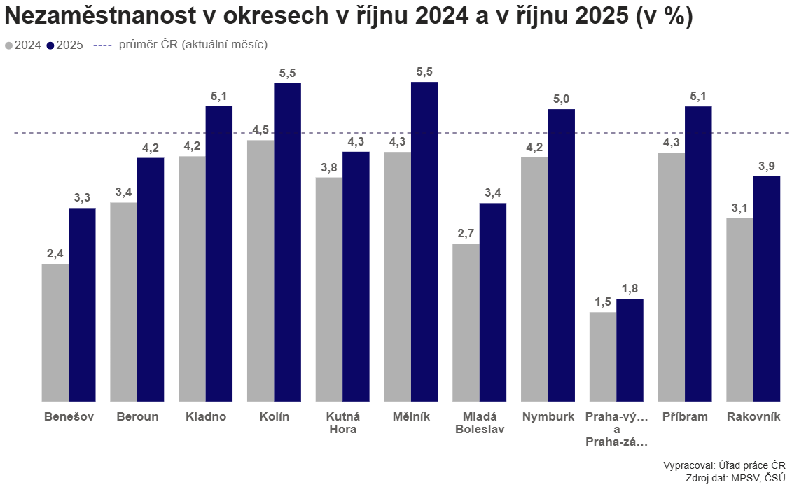Zatímco v okolí Prahy je nezaměstnanost stále nízká, na Příbramsku zůstává vyšší, především kvůli menší nabídce pracovních příležitostí v některých odvětvích. Přesto region nabízí možnosti v průmyslu, logistice i službách, a podle úřadu práce je zde stále prostor pro uplatnění lidí po rekvalifikaci nebo s nově nabytými dovednostmi.