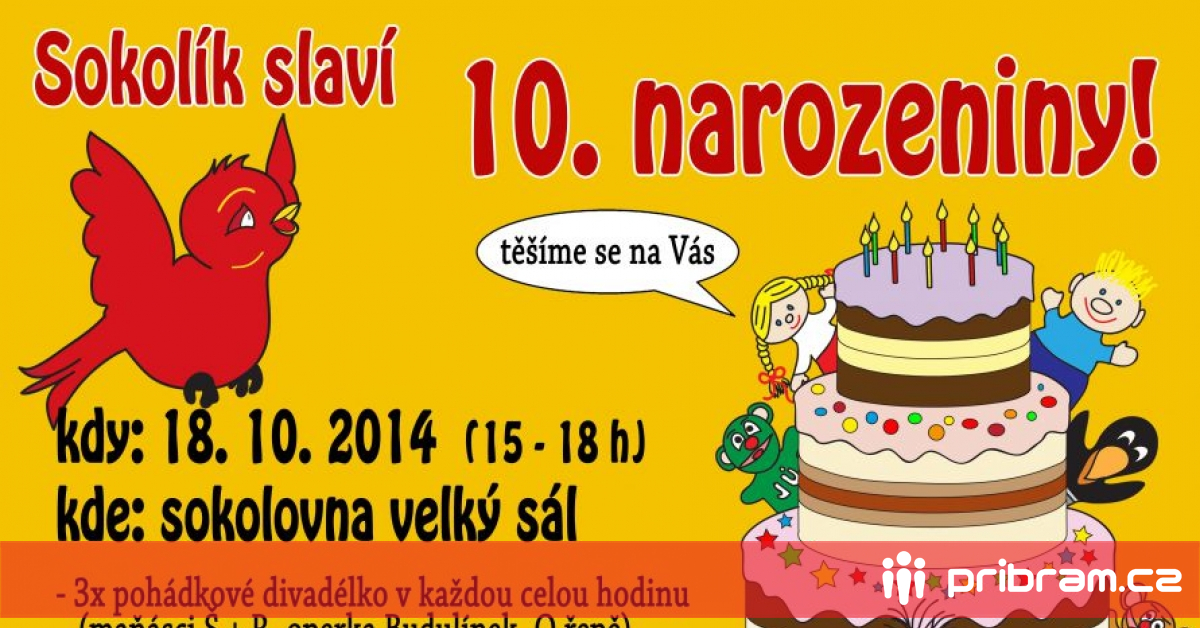 U příležitosti 10. narozenin Dětského klubu Sokolík pořádáme oslavu, která se bude konat v sobotu 18.10.2014 ve velkém sále Sokolovny Příbram od 15 hodin. Srdečně zveme všechny, kteří prošli branami Sokolíka, od miminek až po ty desetileté.