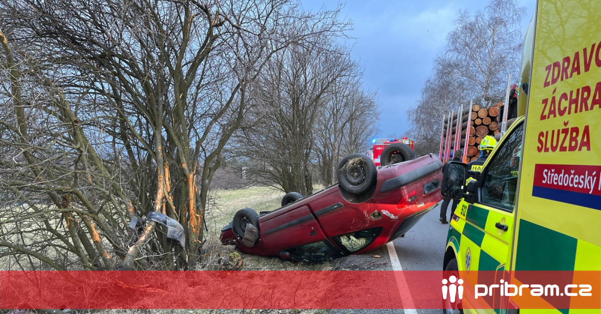 foto: Havarované auto na silnici u Lhoty u Příbramě. / pribram.cz
