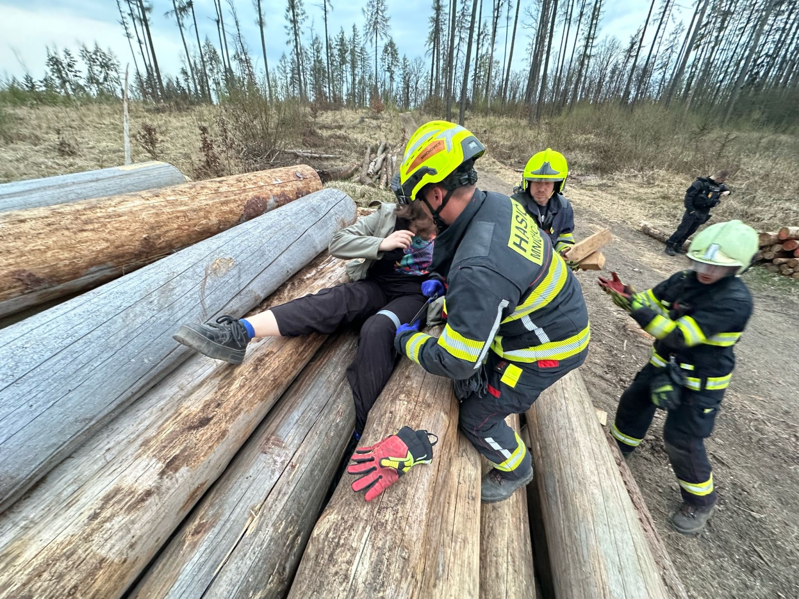 foto: Záchrana dívky, které se zaklínila noha mezi dvě klády na navezené hromadě na okraji lesa. / HZS Středočeského kraje / se souhlasem