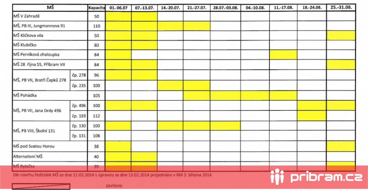 Největší zájem o místa ve školkách v průběhu letních prázdnin je v prvním týdnu v červenci, a proto budou v této době otevřeny prakticky všechny příbramské školky, kromě MŠ Pohádka. O týden později se otevřou všechny MŠ kromě Perníkové chaloupky, Pohádky a MŠ pod Sv. Horou. V dalších týdnech se počet otevřených školek liší, v součtu však bude nabízeno pro děti více míst, než v letech minulých. Přesný rozpis si můžete prohlédnout na přiloženém obrázku.