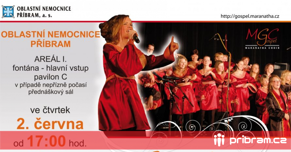 Ve čtvrtek 2. června 2016 od 17:00 hodin pořádá Oblastní nemocnice Příbram v parkovém prostoru před vstupem do hlavní budovy nemocnice v areálu 1 tradiční Jarní koncert v podání oblíbeného sboru MARANATHA GOSPEL CHOIR.