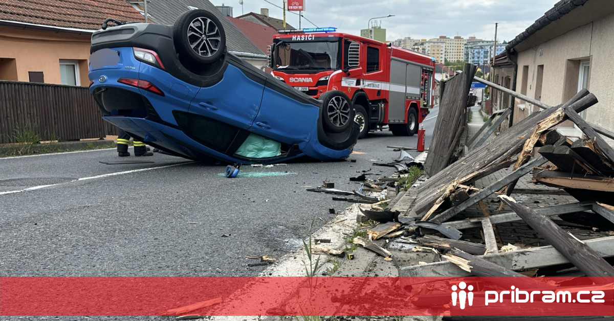 V Příbrami narazila řidička do plotu a přetočila auto na střechu