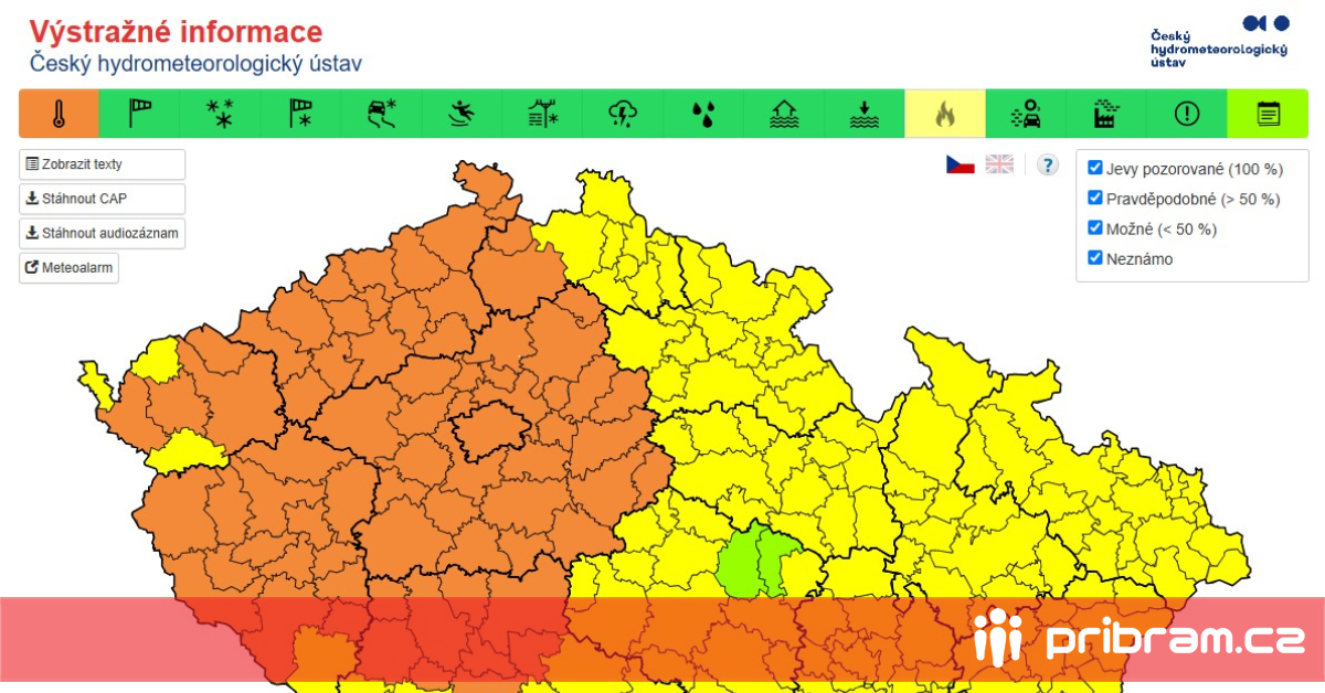 Ve středu 2. července odpoledne a k večeru budou teploty téměř na celém území ČR překračovat 31 °C, v Čechách s výjimkou severovýchodních Čech i 34 °C, v nížinách Čech ojediněle vystoupí až na 37 °C. "Zvýšené riziko vzniku a šíření požárů očekáváme ve středu už v celé jihozápadní polovině území. Riziko vzniku a šíření požárů se ve čtvrtek 3. 7. zvýší i na Moravě a ve Slezsku. V Čechách naopak místy poklesne," zní předpověď na středu a čtvrtek.