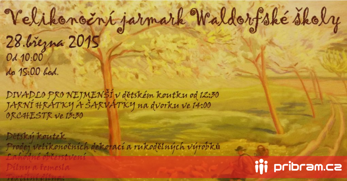 Přijďte se setkat s přáteli na příjemném místě v sobotu 28.3. 2015 na Waldorfské škole v Příbrami, kde bude probíhat od 10 do 15 hodin tradiční velikonoční jarmark. Můžete si s námi zazpívat, zahrát tradiční hry, vidět loutkové divadlo, nakoupit si velikonoční dekorace, odpočinout si a popovídat při dobrém jídle a pití. Srdečně Vás zve Waldorfská škola Příbram.