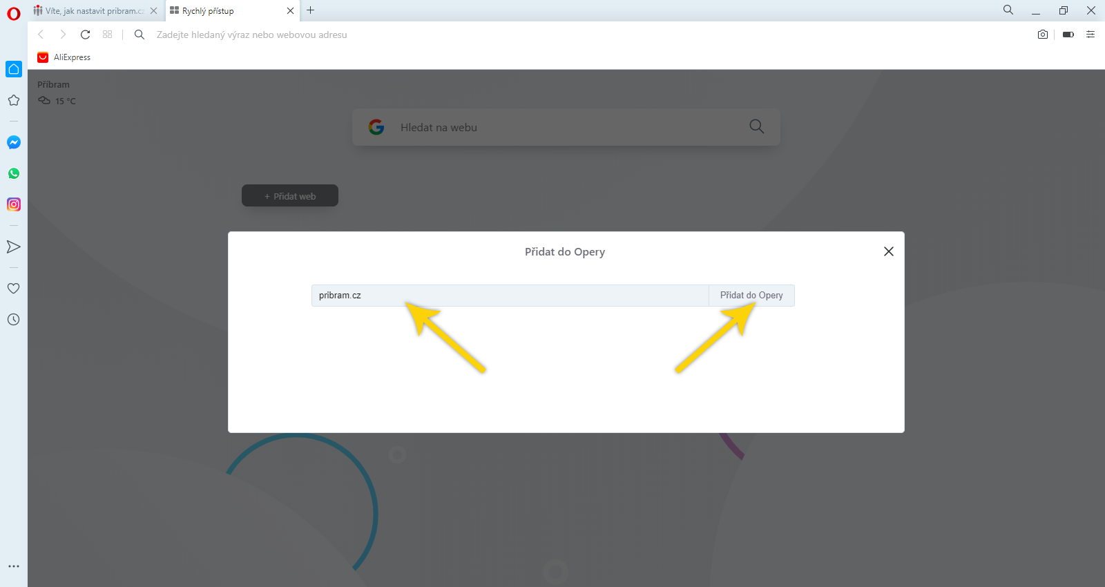 Do textového pole Zadejte adresu pro přidání do Rychlého přístupu https://pribram.cz a klikněte na tlačítko Přidat do Opery.